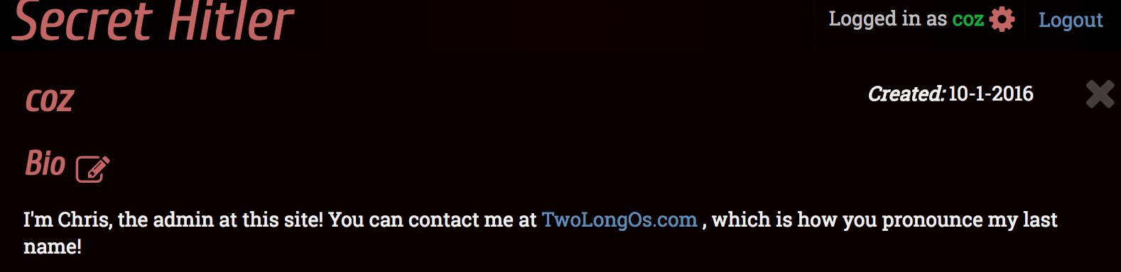 Editors will have an (E) next to their name, and mysterious expanded mod powers! Like assign roles to players, and reveal all roles to themselves. Just kidding. Editors and mods can now do helpful things like temporarily turn off account creation in case of troll attack and disable ip bans so that a group from one location can get around the 1 account per day limit.