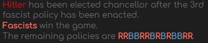 - A 3 second delay has been implemented between the inactment of a policy by the chancellor, and the ability for the government to make a claim (for non-experienced games only). This should change game play a lot I think..